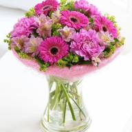 Этот изысканный букет полностью состоит из различных цветов розового оттенка, благодаря чему он выглядит невероятно нежно и изысканно. Гербера, входящая в состав композиции, символизирует радость и веселье, она создана, чтобы дарить радость и улыбку, а гвоздика позволит вам продемонстрировать нежные чувства к получателю, а также свою надежность и готовность помочь. Разные оттенки розового цвета гармонично разбавлены добавлением зелени салала, которая придала букету свежести и эффектности.